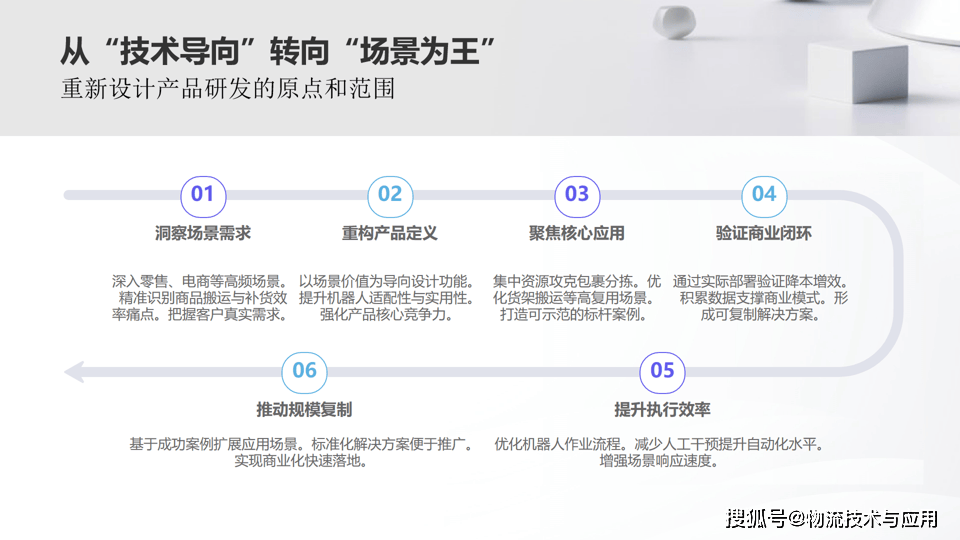 正在具体实施层面,企业该当成立系统化的场景研究机制。选择零售、电商、先辈制制等物流功课强度高、痛点明白的行业做为沉点研究范畴;通过现场调研、数据阐发、流程建模等多种方式,全面理解客户正在收货、存储、挑撰、包拆、发运等各个环节的功课特点和要求;基于这些洞察,从头定义产物功能和手艺架构,使研发的视野笼盖客户场景的360度全视角和产物生命周期的全周期。